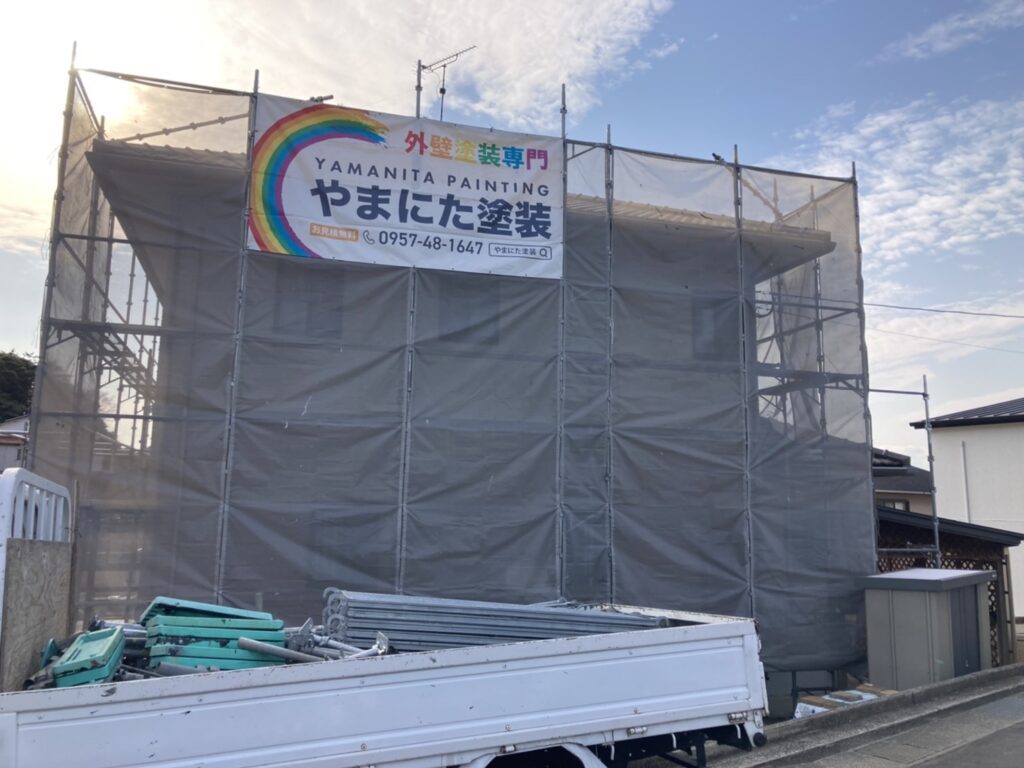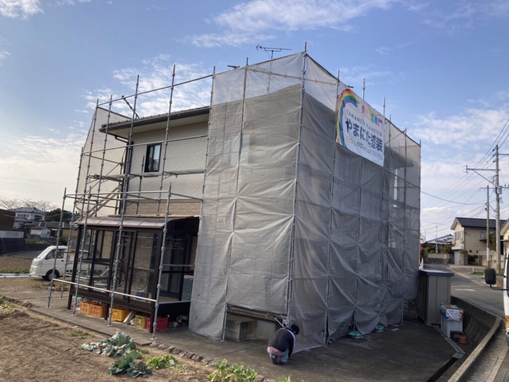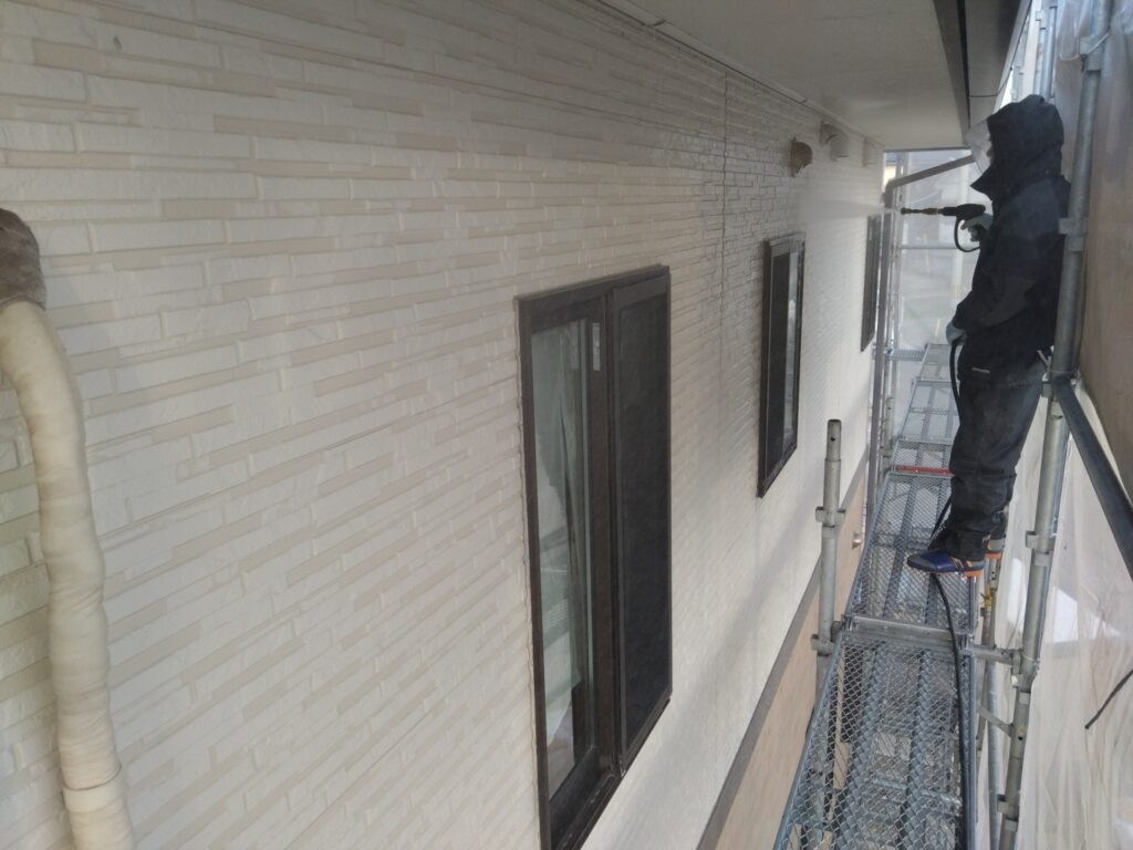 足場設置作業が終わり、外壁や屋根についた砂埃などの汚れをきれいに洗い流しました。
