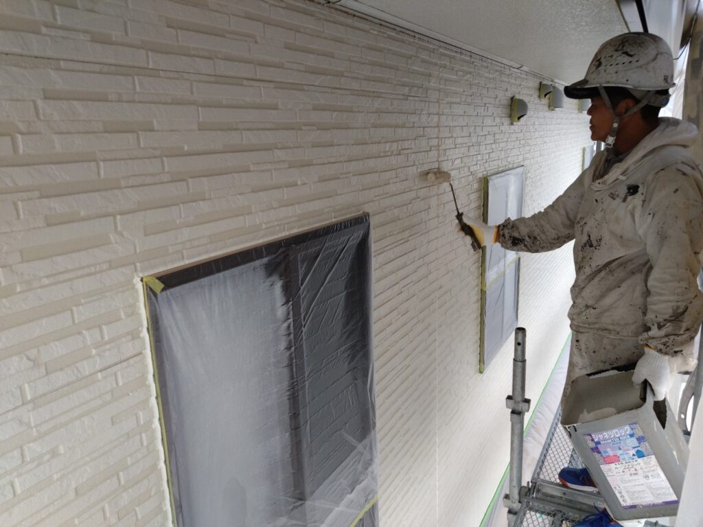 ◆下塗り材を乾燥させたあと、規定の塗布量を守るため、塗料をたっぷりと使用し上塗り2回塗りを行いました。塗ムラや塗り残しがないように丁寧に仕上げました。