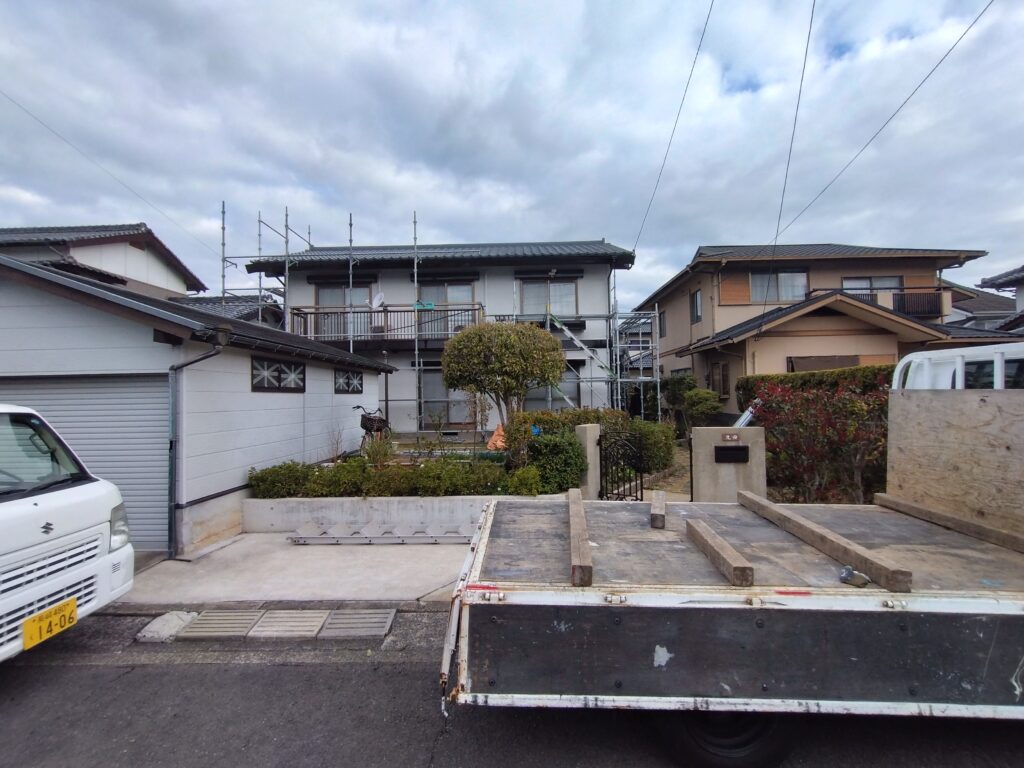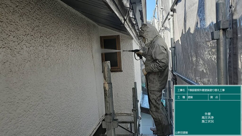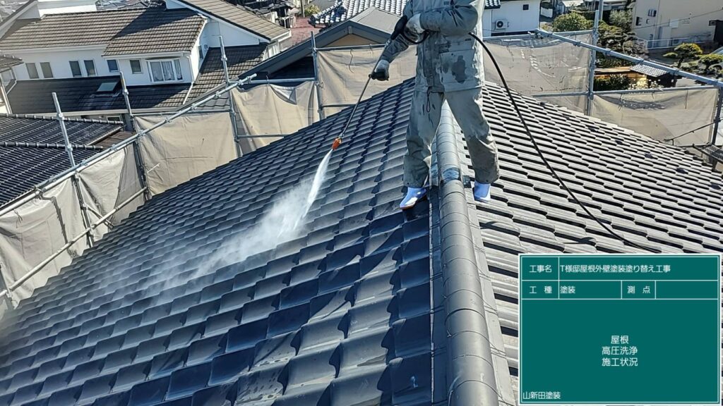 足場設置作業が終わり、外壁や屋根についた砂埃などの汚れをきれいに洗い流しました。