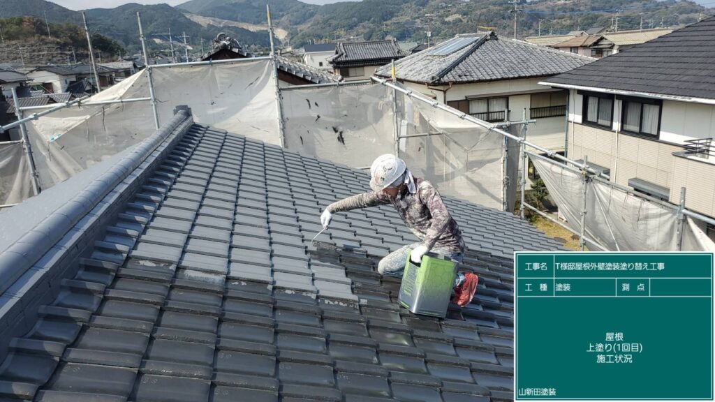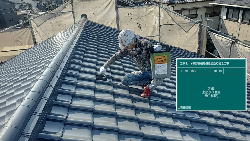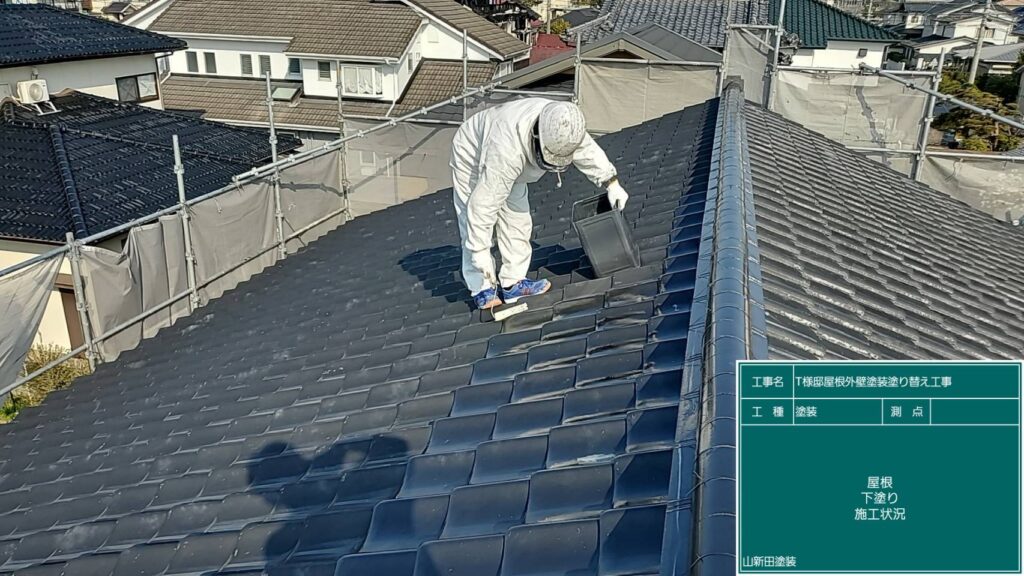 ◆屋根材と上塗りをしっかり密着させるために、下塗り材を塗っていきました。