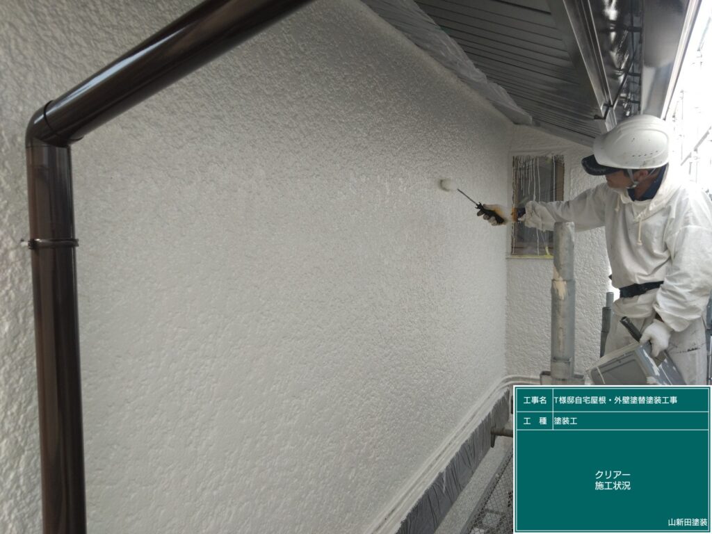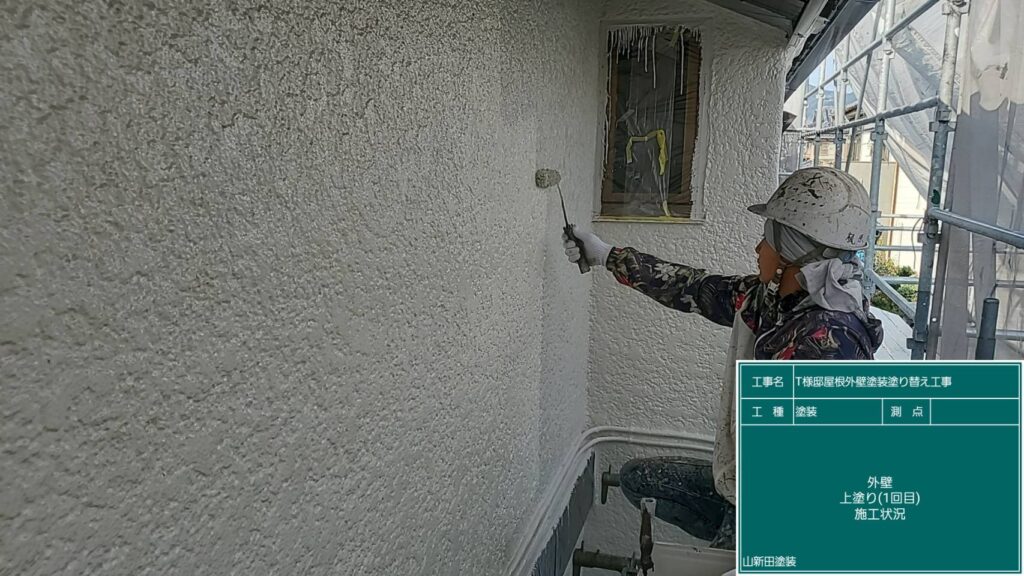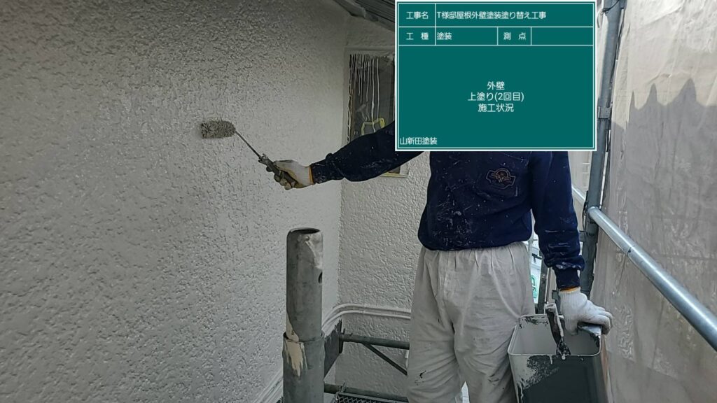 ◆下塗り材を乾燥させたあと、規定の塗布量を守るため、塗料をたっぷりと使用し上塗り2回塗りを行いました。塗ムラや塗り残しがないように丁寧に仕上げました。