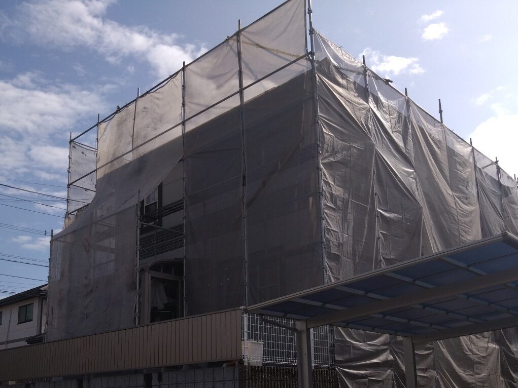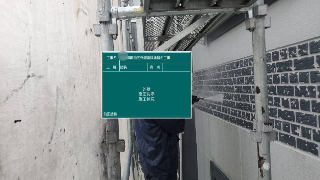 足場設置作業が終わり、外壁や屋根についた砂埃などの汚れをきれいに洗い流しました。