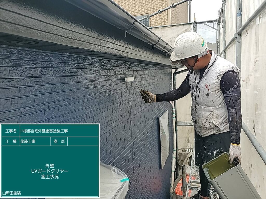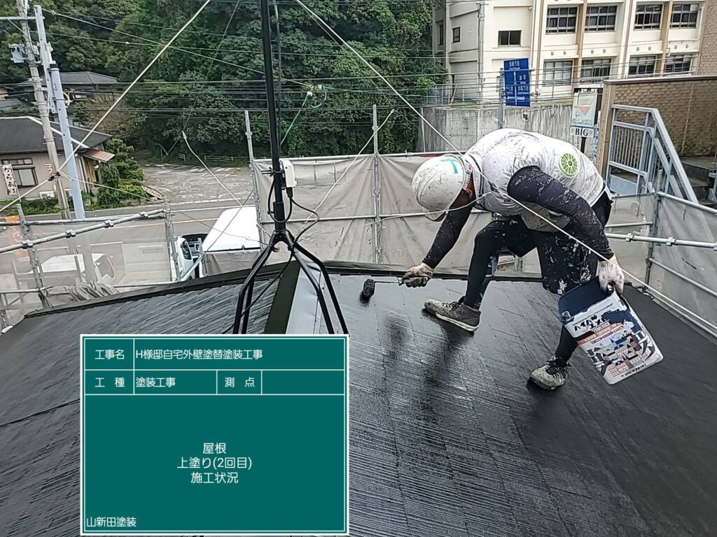◆下塗り材を乾燥させたあと、規定の塗布量を守るため、塗料をたっぷりと使用し上塗り2回塗りを行いました。塗ムラや塗り残しがないように丁寧に仕上げました。