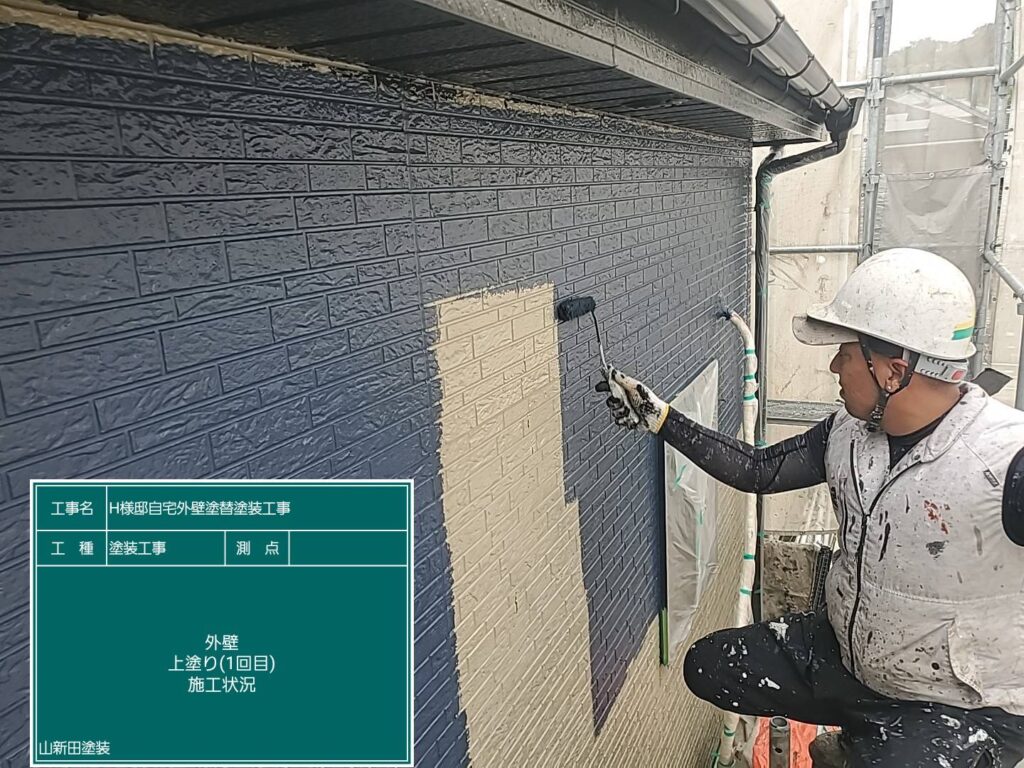 ◆下塗り材を乾燥させたあと、規定の塗布量を守るため、塗料をたっぷりと使用し上塗り2回塗りを行いました。