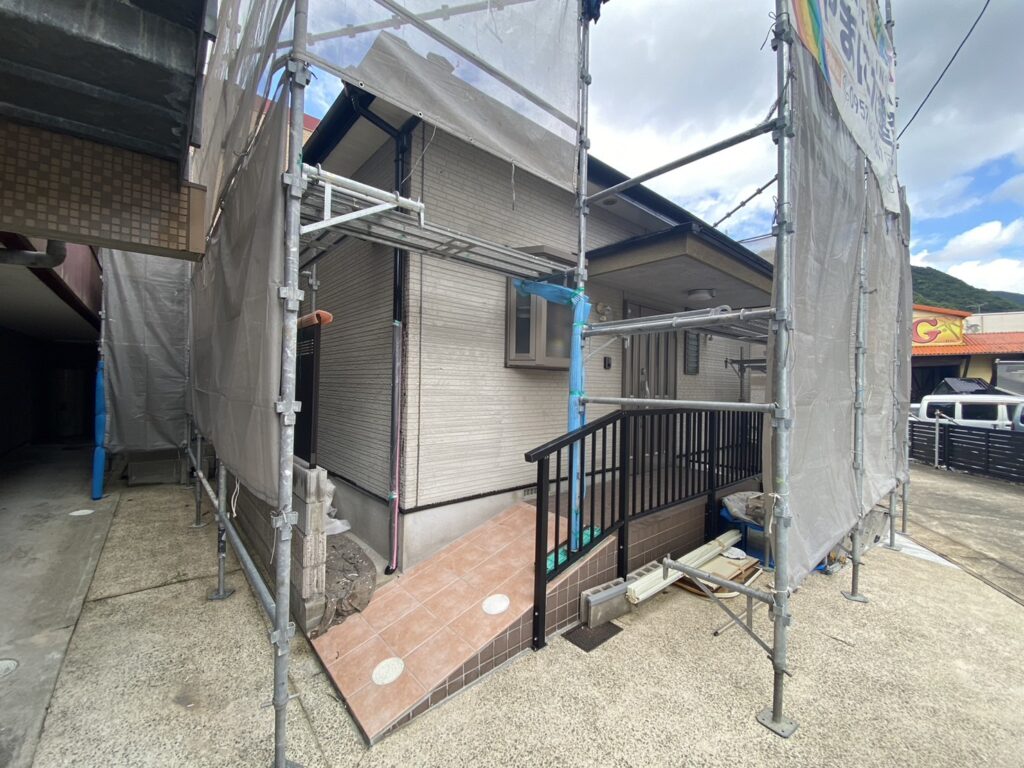 足場設置作業が終わり、外壁や屋根についた砂埃などの汚れをきれいに洗い流しました。
