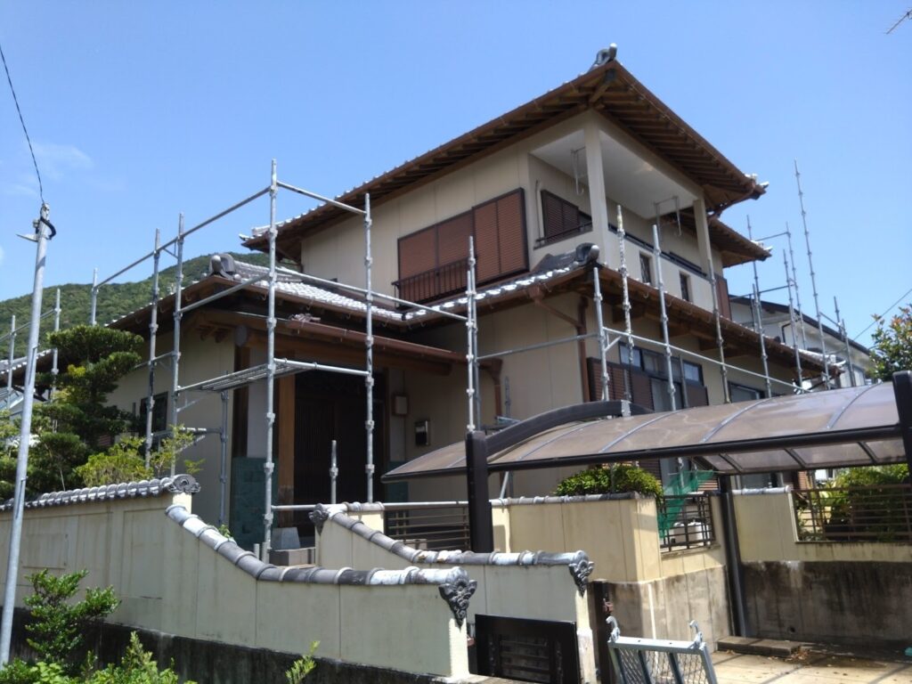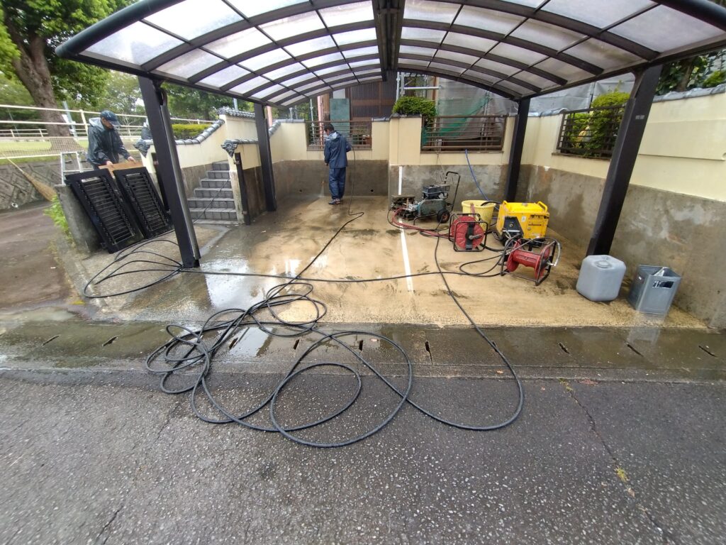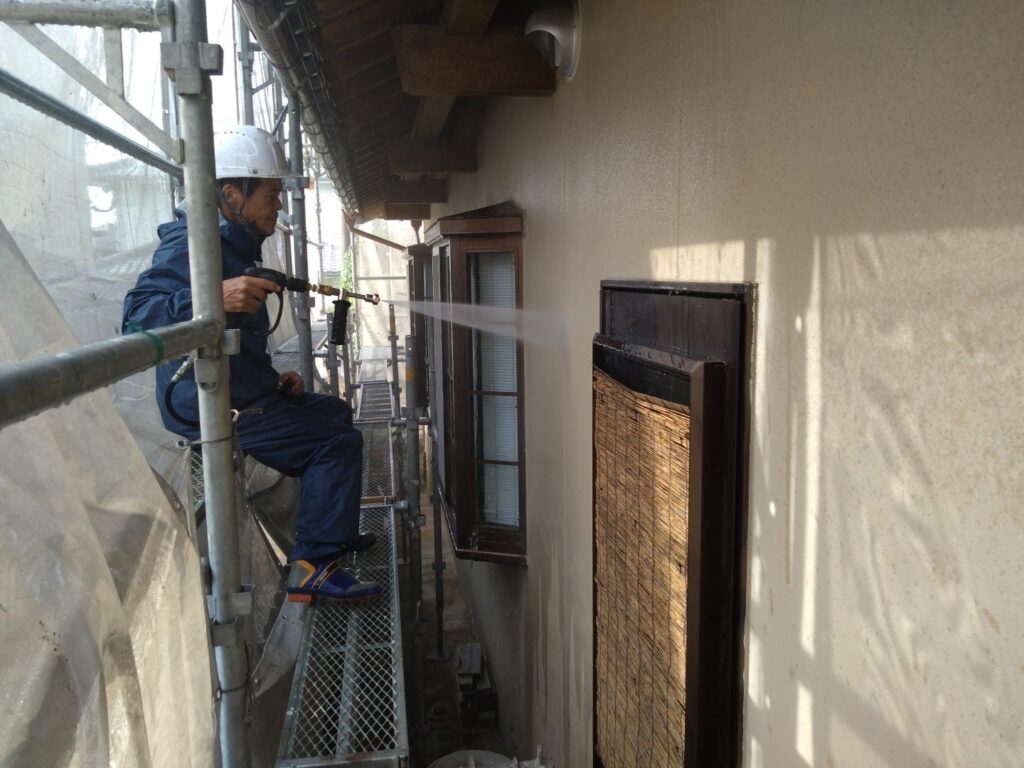足場設置作業が終わり、外壁や屋根についた砂埃などの汚れをきれいに洗い流しました。