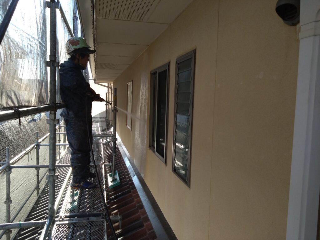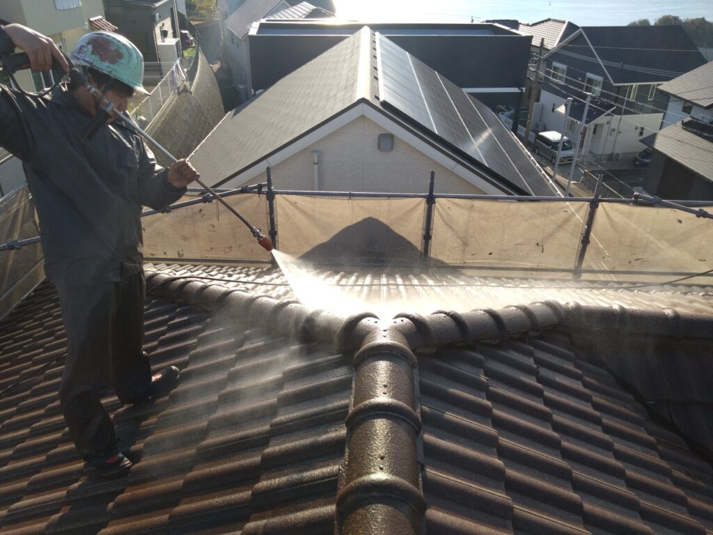 足場設置作業が終わり、外壁や屋根についた砂埃などの汚れをきれいに洗い流しました。