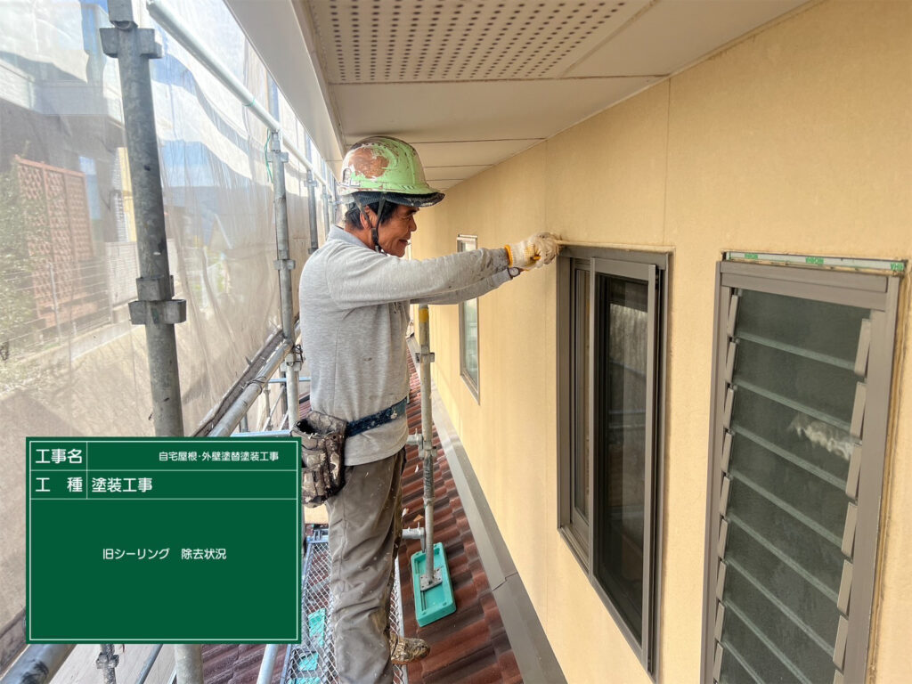 既存のコーキングを専用カッターナイフで、外壁を傷つけないように注意しながら撤去しました。