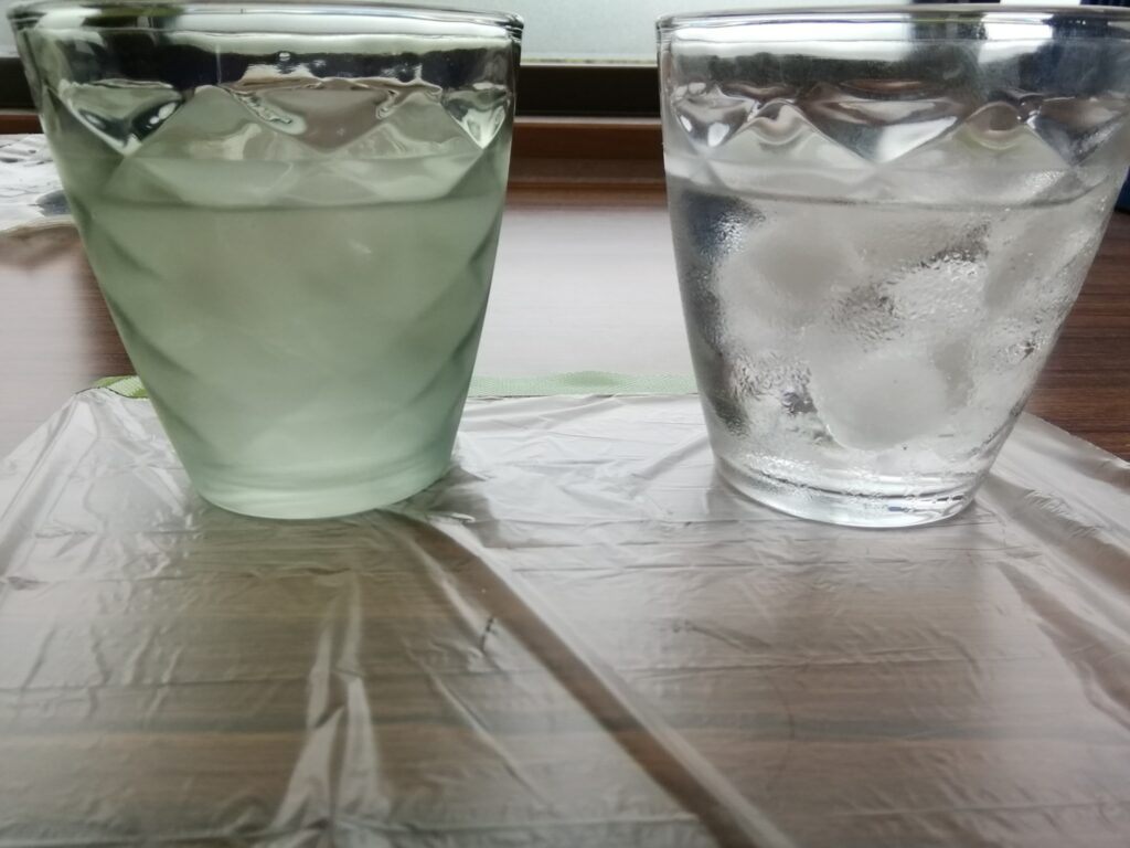 やまにた塗装のガラスコーティングを施したコップ(左側)と施していないコップ(右側)にそれぞれ氷水を入れ、コップの周りにどれだけ水滴が出るのかという実験を行った画像です。