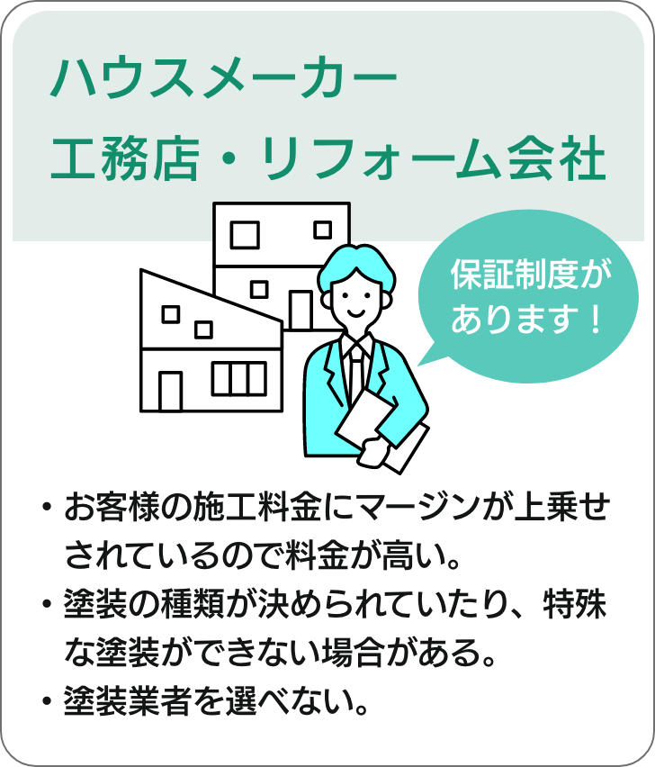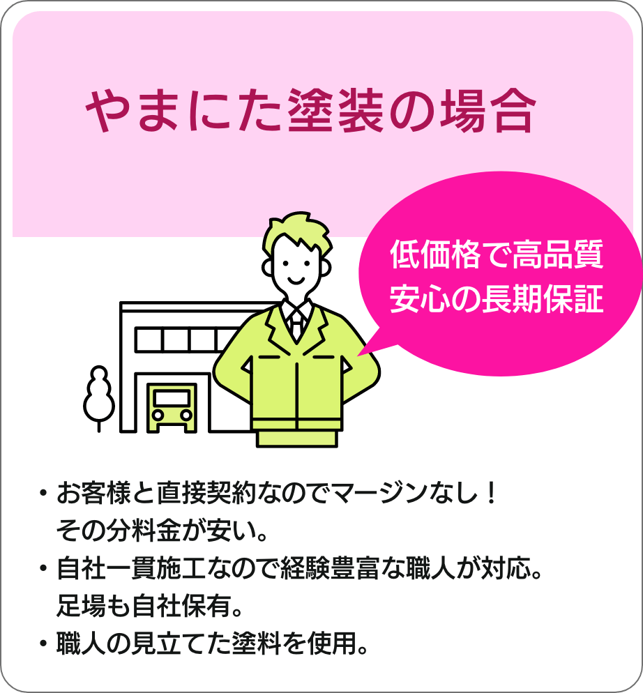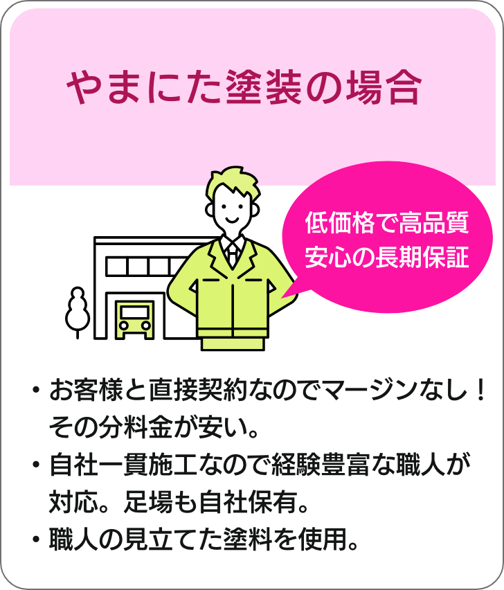 やまにた塗装は元請けとして施工。また足場も自社保有。ハウスメーカーや工務店などが塗装を行う場合、塗装業者へ下請けしマージンが発生。やまにた塗装に塗装を依頼するとはそれがないんです!