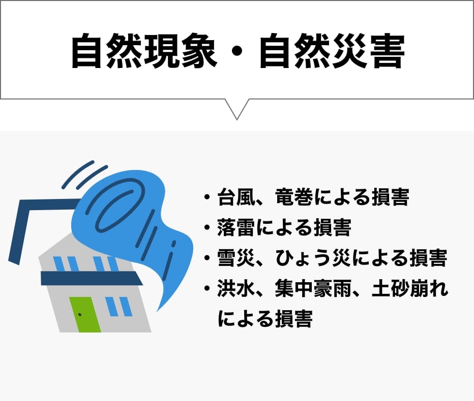 火災だけではなく、台風・風災・落雷・雪害・水濡れなどの天災による破損、または