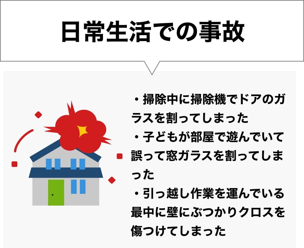 火災だけではなく、台風・風災・落雷・雪害・水濡れなどの天災による破損、または突発的な事故による住宅設備の破損なども補償対象になりえます。