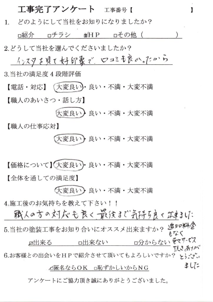 職人の方の対応が良く、最後まで気持ち良く工事完了 長崎県長崎市 BEFORAFTERQどのようにしてやまにた塗装をお知りになりましたか?AHP・LINE見積りQどうしてやまにた塗装を選んで下さいましたか?Aインスタを見て好印象で、口コミも良かったからQ施工後の今のお気持ちを教えて下さい。 A職人の方の対応も良く、最後まで気持ち良く出来ました。追加料金もなく色々サービス頂きありがとうございました。