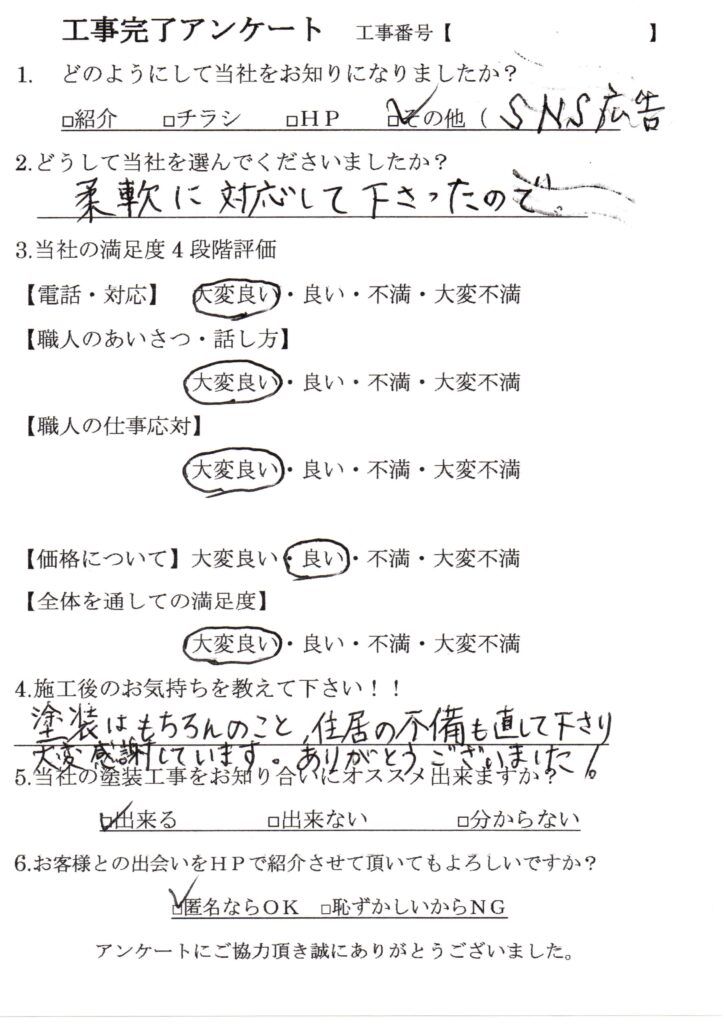 塗装はもちろんのこと、住居の不備も直して下さり大変感謝しています。ありがとうございました!