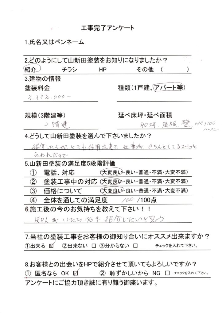 外壁塗装をしたい知人がいたら、必ず紹介したいと思いました!長崎県諫早市 アパート屋根・外壁塗替塗装工事Qどのようにしてやまにた塗装をお知りになりましたか?A知人の紹介Qどうしてやまにた塗装を選んで下さいましたか?A紹介してくれた知人が、やまにた塗装の事を「とても信用できて、仕事がきちんとしてる」と言われたのでQ施工後の今のお気持ちを教えて下さい。 A塗装をしたい知人がいたら、必ず紹介したいと思います