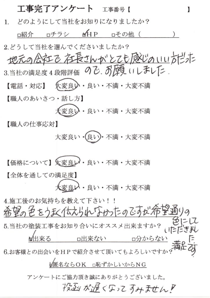 希望通りの色にしていただきました! 長崎県長崎市BEFORAFTERQどのようにしてやまにた塗装をお知りになりましたか?AHPQどうしてやまにた塗装を選んで下さいましたか?A地元の会社で社長さんがとても感じのいい方だったのでお願いしましたQ施工後の今のお気持ちを教えて下さい。 A希望の色をうまく伝えられなかったのですが希望通りの色にしていただきました満足です
