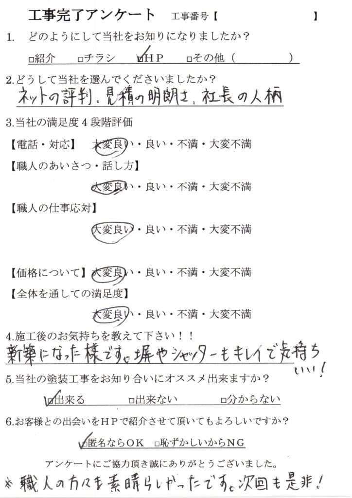 職人の方々も素晴らしかったです!! 長崎県長崎市DCP PHOTOQどのようにしてやまにた塗装をお知りになりましたか?AHPQどうしてやまにた塗装を選んで下さいましたか?Aネットの評判、見積りの明朗さ、社長の人柄Q施工後の今のお気持ちを教えて下さい。 A新築になった様です。塀やシャッターもキレイで気持ちいい!
